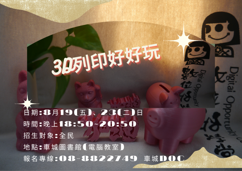 最新消息 DOC快訊 ::: <上一則 返回列表 下一則> 3D列印好好玩 發布日期:2022-08-02 人氣:169 1.3D列印設計程式體驗 2.實際設計作品列印日期:8月19(五)、23(二)日 時間:晚上18:50~20:50 招生對象:全民 地點:車城圖書館(電腦教室) 報名專線:08-8822749 車城DOC <上一則 返回列表 下一則>
