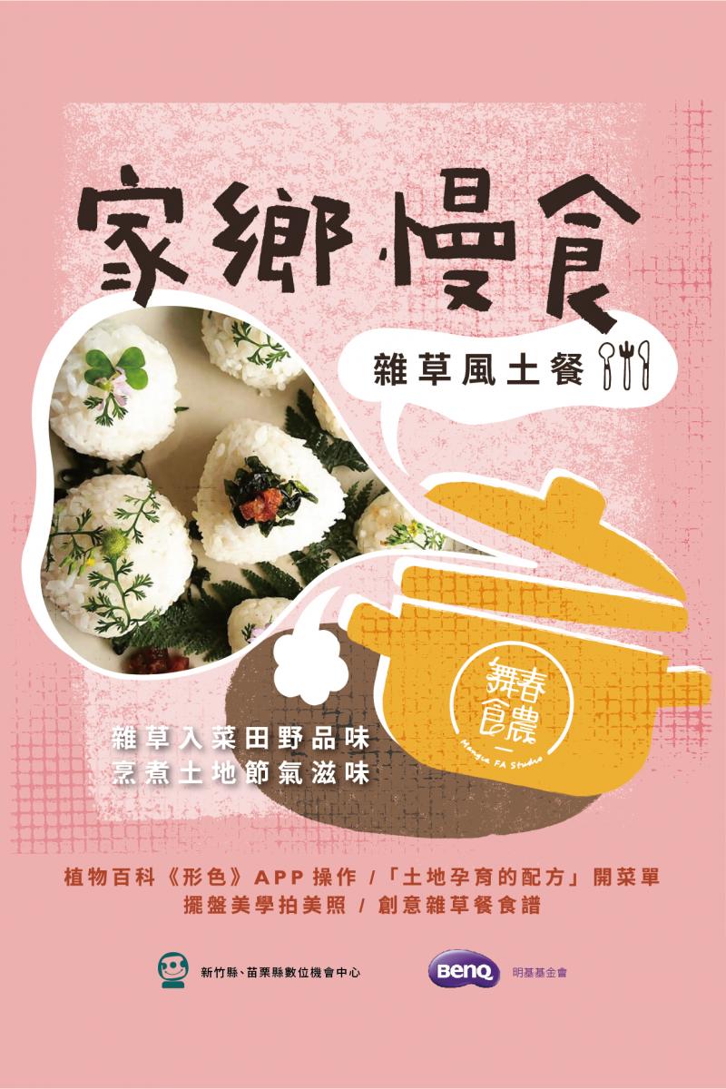 《家鄉慢食 — 雜草風土餐桌》首先介紹野菜,邀請學員分享食用野菜的經驗,走入社區採集在地野草,透過軟體認識家鄉野菜,最後由老師設計專屬食譜,共同製作創意野菜料理,搭配餐桌擺盤技巧,成品除了吃到野菜鮮甜,更融合社區在地的美味。