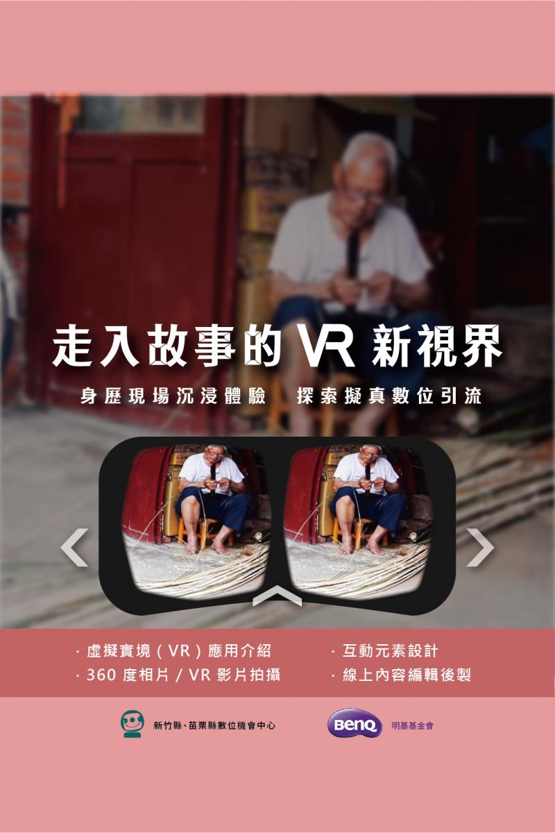 《走入故事的 VR 新視界》帶領學員接觸新興科技,體驗各式 VR 影像,認識生活應用「Google 街景」;接著走入社區,拍攝 360 度街景,製作數位 VR 家鄉導覽地圖,在家也能走讀竹苗。