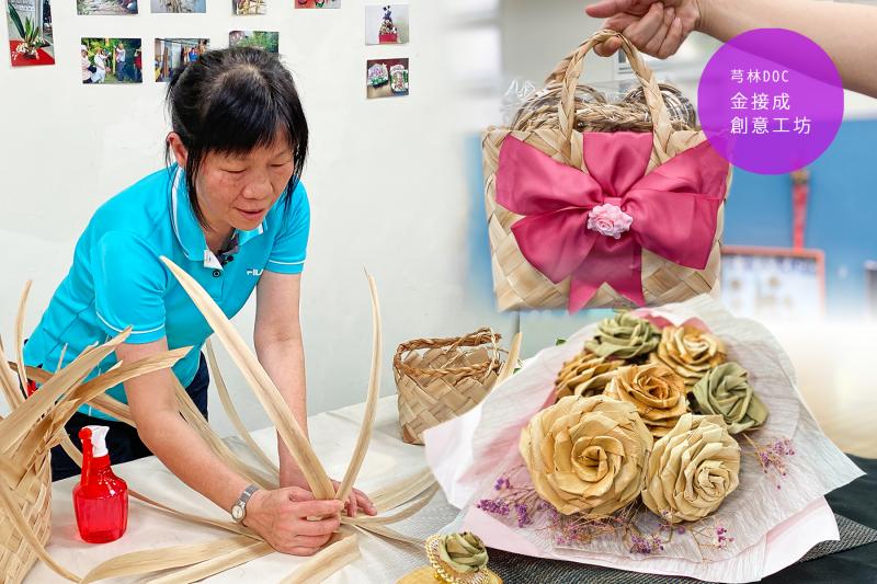 恩菊姐與社區長輩互動過程中,學習月桃編織技法,重建「月桃窩」復育基地,開發創意月桃葉產品,製成實用精緻的筆筒、杯袋、手提袋、趣味跳繩、玫瑰造型捧花,設計月桃導覽手作課程,以創新思維保存推廣先人生活智慧。