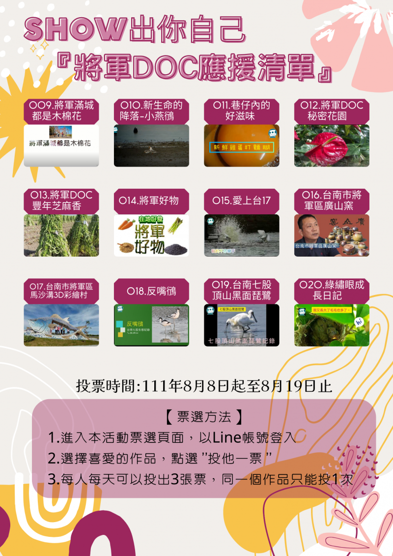 最新消息 DOC快訊 ::: <上一則 返回列表 下一則> 「SHOW出你自己」短影音競賽最後催票!! 發布日期:2022-08-17 人氣:182 投票時間:111年8月8日起至8月19日止 以下為作品投票網址 https://reurl.cc/3jgO10 【票選方法】 1.進入本活動票選頁面,以Line帳號登入 2.選擇喜愛的作品,點選 ”投他一票 ” 3.每人每天可以投出3張票,同一個作品只能投1次 <上一則 返回列表 下一則>