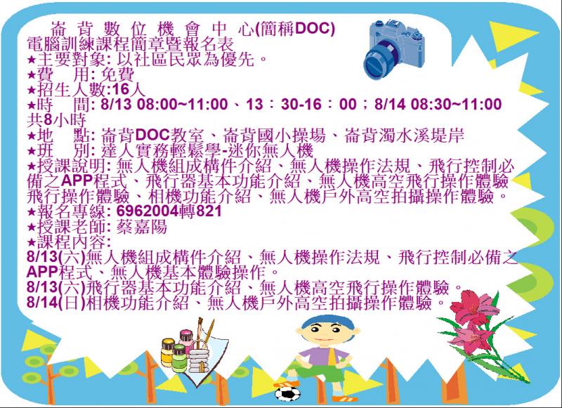 最新消息 DOC快訊 ::: <上一則 返回列表 下一則> 達人實務輕鬆學-迷你無人機招生訊息 發布日期:2022-08-07 人氣:171 達人實務輕鬆學-迷你無人機招生訊息 <上一則 返回列表 下一則>