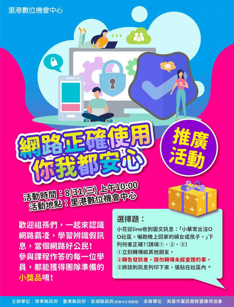 最新消息 DOC快訊 ::: <上一則 返回列表 下一則> 網路正確使用 你我都安心 發布日期:2022-08-26 人氣:196 在現今的網路世代,人人一支手機在身,在網路上發表言論除了要非常小心注意以外,若真的遇上網路霸凌時又該怎麼處理呢? 8/31(三)早上10點”網路正確使用 你我都安心”的活動即將在里港DOC開課,歡迎祖孫們、叔伯阿姨們來一起認識網路霸凌,學習辨識假訊息,當個網路好公民。 <上一則 返回列表 下一則>