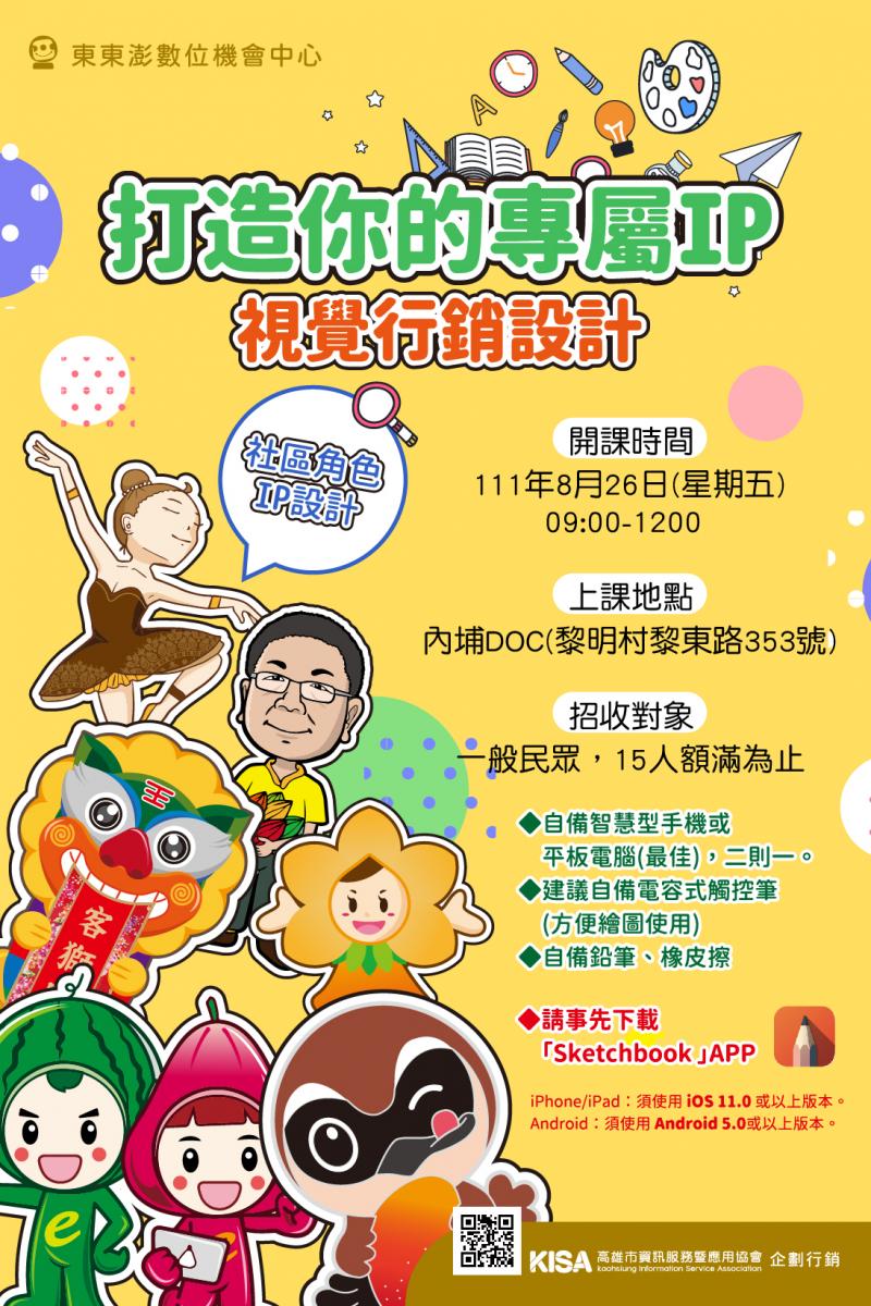 最新消息 DOC快訊 ::: <上一則 返回列表 下一則> 【圖像到品牌,打造你的專屬IP】 發布日期:2022-08-15 人氣:177 報名:https://forms.gle/FTo7BpW5QkmBPvwu5 開課時間確定囉!!!! 111/08/26(五) 9:00-12:00 地點:內埔DOC(黎明村黎東路353號) 還有名額想學設計IP的學員 趕緊報名~~~ 十五人額滿為止!!!! <上一則 返回列表 下一則>