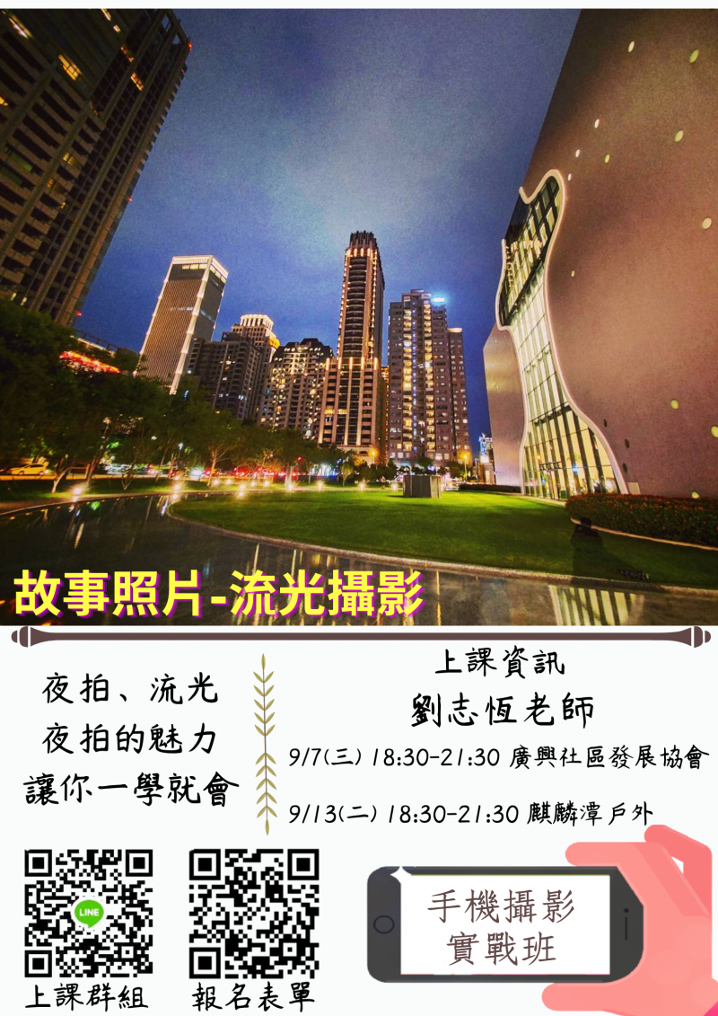 最新消息 DOC快訊 ::: <上一則 返回列表 下一則> 故事照片-流光攝影 發布日期:2022-08-28 人氣:192 中秋節快到了,還在為了晚上烤肉賞月拍照不好看而煩惱嗎? 鹿谷DOC免費實體課程,手把手教你夜晚手機怎麼拍出新花樣 *實體課程* 授課講師: 劉志恆老師 *上課時間:* *9/7* 週三 18:30-21:30 廣興社區發展協會教室上課 *9/13* 週二 18:30-21:30 麒麟潭戶外上課 報名上課請點連結填報名表 或舊生報名聯絡我即可 https://forms.gle/3AvmMnaMB5EgP9gv7 <上一則 返回列表 下一則>