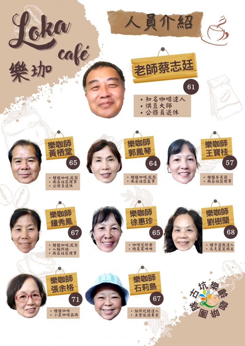 最新消息 DOC快訊 ::: <上一則 返回列表 下一則> 古坑樂齡咖啡師(樂咖師) 發布日期:2022-08-17 人氣:148 由一群熱愛咖啡的樂齡族組成的樂咖師,在退休後持續參與社區活動,為社區帶來新活力。 他們從零開始,認真學習咖啡專業知識、持續練習烘培技術、訓練自己的味覺與嗅覺辨識,成為一個能品味咖啡學的咖啡師。 -------------------------------------- 111年9月1號 〝一日限定〞 歡迎來品嘗 星期四 09:00-11:00AM 〝一日限定〞 1. 爺奶手沖咖啡 2. 濾掛式咖啡包/盒 3. 爺奶精品咖啡豆 地點:古坑哈比屋(社區發展協會) 雲林縣古坑鄉文淵路14巷7號 <上一則 返回列表 下一則>