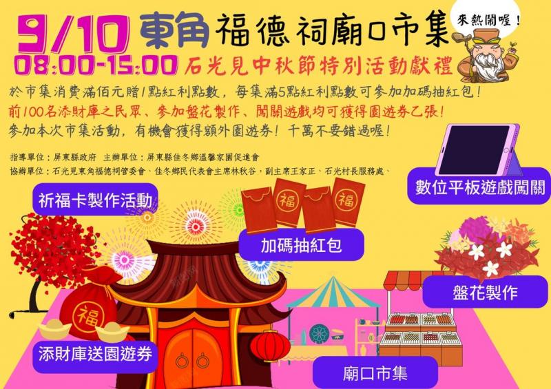 最新消息 DOC快訊 ::: <上一則 返回列表 下一則> 阿伯生日快樂! 今年中秋連續假日,阿伯邀請大家做伙來熱鬧! 發布日期:2022-09-06 人氣:222 阿伯生日快樂! 今年中秋連續假日,阿伯邀請大家做伙來熱鬧! 【東角福德祠廟口市集】 活動時間:9月10日星期六上午8點至下午3點 活動地點:佳冬鄉石光見東角福德祠廣場(石光村東角路與學府路)…… <上一則 返回列表 下一則>