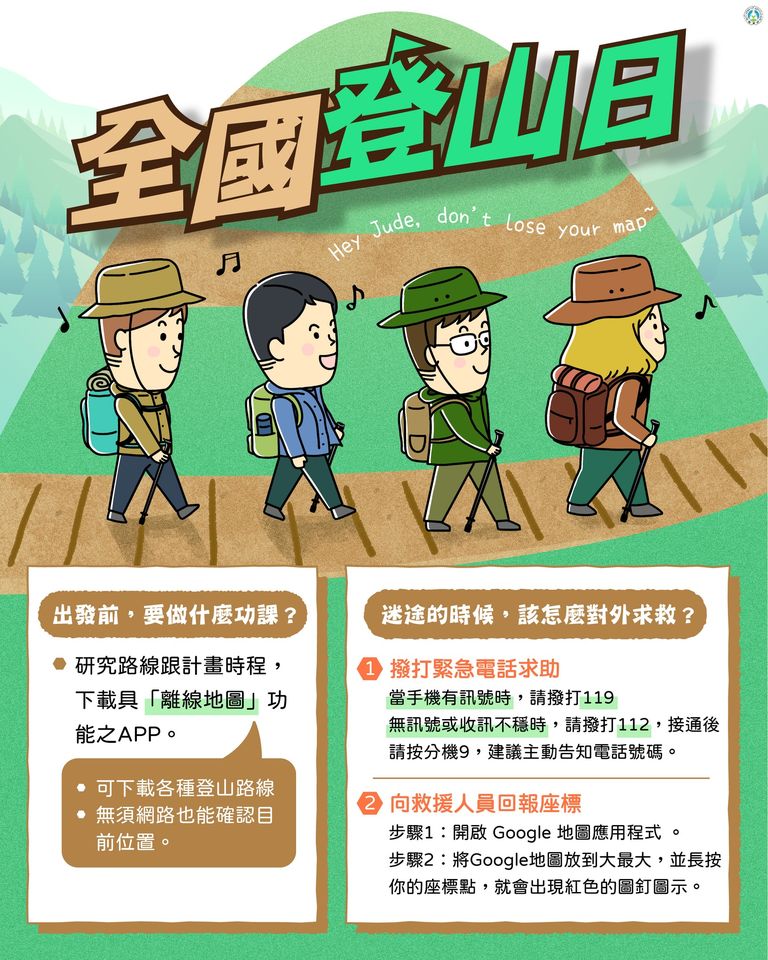 最新消息 DOC快訊 ::: <上一則 返回列表 下一則> 10/1是全國登山日,出門要下載具「離線地圖」功能之app唷! 發布日期:2022-10-01 人氣:210 ▍出發前,要做什麼功課? 研究路線跟計畫時程,並下載具「離線地圖」功能之app,可下載各種登山路線,無須網路也能確認目前位置。 ▍迷途的時候,該怎麼對外求救? ①撥打緊急電話求助 當手機有訊號時,請撥打119;無訊號或收訊不穩時,請撥打112,接通後請按分機9,建議主動告知電話號碼。 ②向救援人員回報座標: 步驟1:開啟 Google 地圖應用程式 。 步驟2:將Google地圖放到大最大,並長按你的座標點,就會出現紅色的圖釘圖示。 <上一則 返回列表 下一則>
