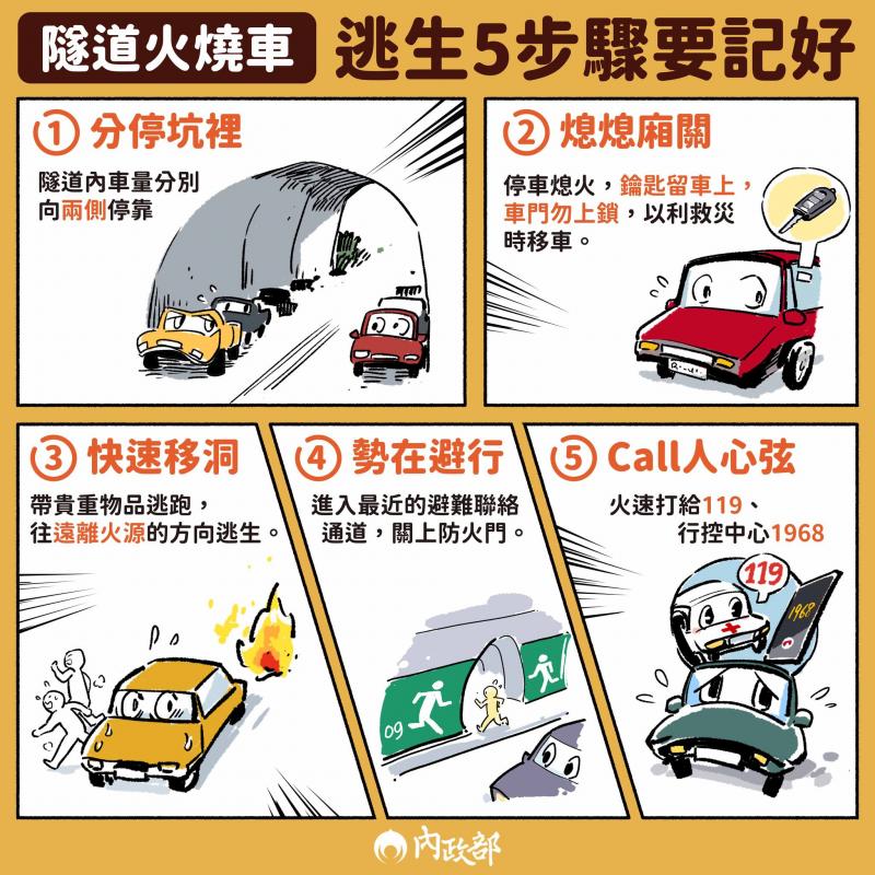 若不知道火源位置,請「往車輛行駛的反方向離開」。此外,因黑煙多分布在較高處,逃生時應盡量壓低身形。