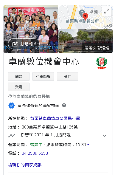 最新消息 DOC快訊 ::: <上一則 返回列表 下一則> Google I See You 發布日期:2022-10-19 人氣:196 課程內容:登錄驗證、Google 商家、豐富商家圖文影音、行銷經營網路商家 課程時間: 10/28(五)18:30-21:30 11/01(二)18:30-21:30 課程地點: 卓蘭DOC (苗栗縣卓蘭鎮卓蘭國小) 地址:苗栗縣新厝里中山路125號 報名窗口:詹雅琦0988-822-464 <上一則 返回列表 下一則>