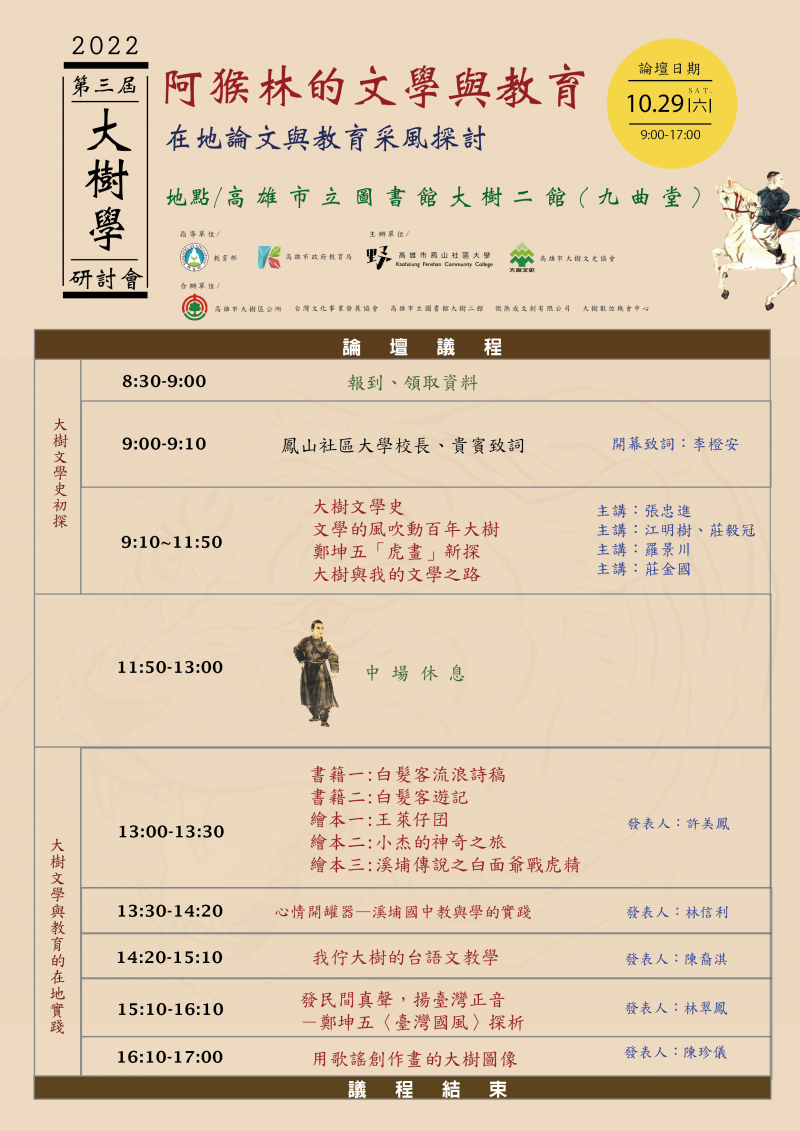 最新消息 DOC快訊 ::: <上一則 返回列表 下一則> 研討會資訊-2022第三屆大樹學研討會-阿猴林的文學與教育 發布日期:2022-10-21 人氣:169 2022第三屆大樹學研討會 阿猴林的文學與教育 在地論文與教育采風探討 論壇日期 : 10.29 (六) 9:00-17:00 地點 : 高雄市立圖書館大樹二館 (九曲堂) 指導單位 : 教育部 、高雄市政府教育局 主辦單位 : 高雄市鳳山社區大學 、高雄市大樹文史協會 合辦單位 : 高雄市大樹區公所 、台灣文化事業發展協會、高雄市立圖書館大樹二館、微熟成文創有限公司、大樹數位機會中心 <上一則 返回列表 下一則>