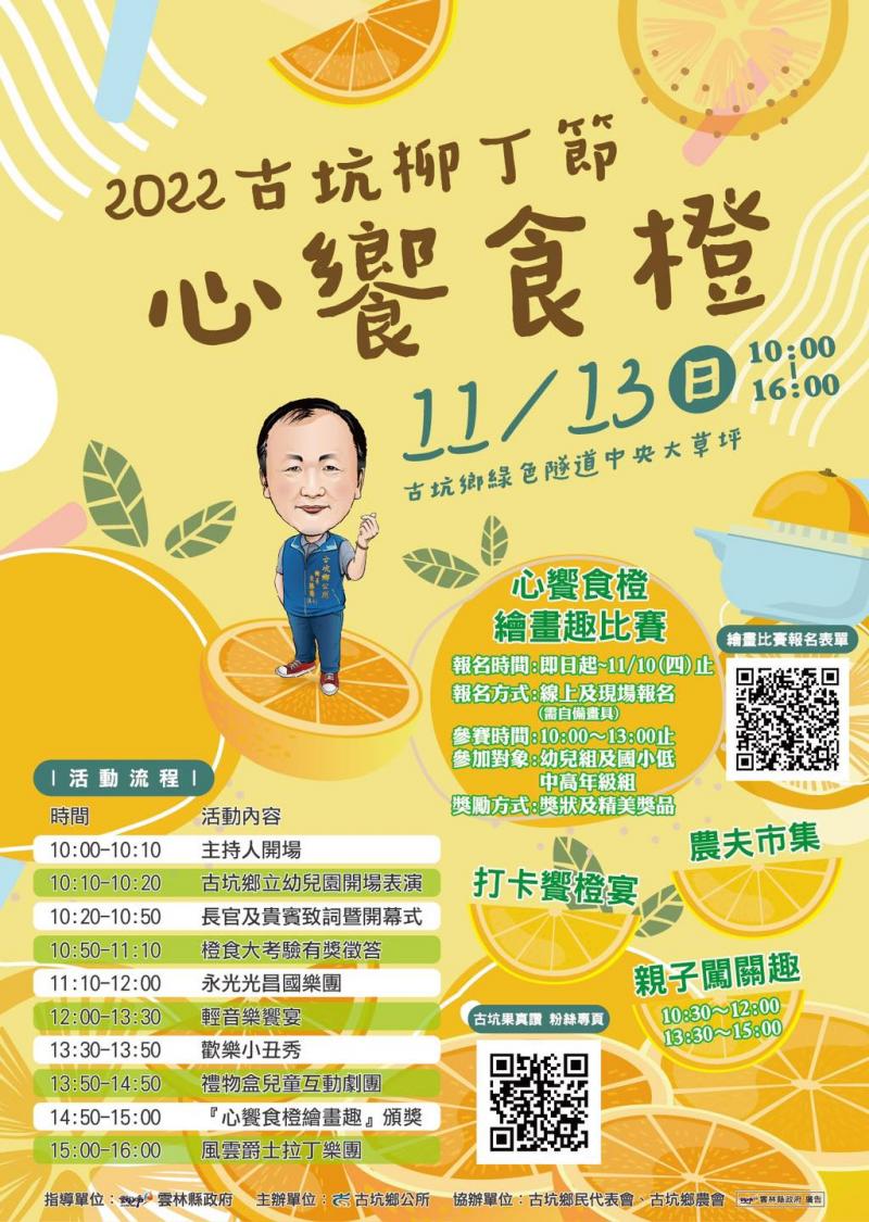 最新消息 DOC快訊 ::: <上一則 返回列表 下一則> 古坑柳丁節「心饗食橙」將在11/13日登場囉 發布日期:2022-10-27 人氣:142 周日還想再煩惱要去哪放鬆嗎? 古坑柳丁節「心饗食橙」將在11/13日登場囉 活動超豐富的喔~ 有一系列的舞台表演、心饗食橙繪畫趣比賽(線上報名)、親子趣味闖關遊戲、禮物盒兒童劇團、小丑氣球秀、遊戲氣墊、打卡饗橙宴、農夫市集,天啊!!!也太多活動了吧!!!不僅可以享用美食及音樂的饗宴又可以跟小朋友一起體驗超多活動~~~ 馬上在行事曆上”柳”好日期帶小朋友來放風~~~ <上一則 返回列表 下一則>