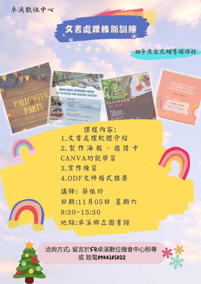 最新消息 DOC快訊 ::: <上一則 返回列表 下一則> 111年輔導團課程-文書處理技能訓練 發布日期:2022-10-28 人氣:195 教你做海報一次就上手,快來參加卓溪數位免費課程~讓你實力大增!! 宣傳單、邀請卡提供許多範本可直接套用!讓你有創意又不煩惱,成果絕對秒變專家 歡迎大家快來報名~ <上一則 返回列表 下一則>