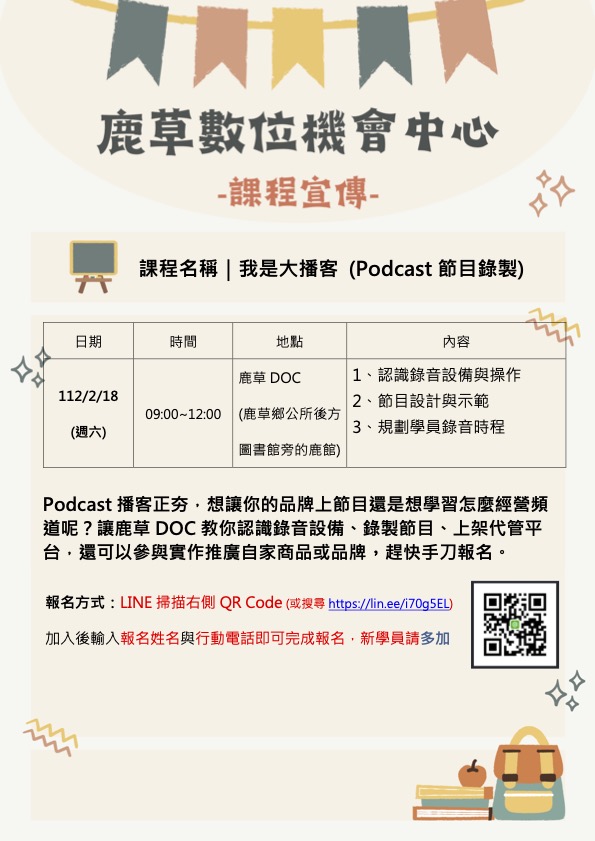 Podcast播客正夯,想讓你的品牌上節目還是想學習怎麼經營頻道呢?讓鹿草DOC教你認識錄音設備、錄製節目、上架代管平台,還可以參與實作推廣自家商品或品牌,趕快手刀報名。
