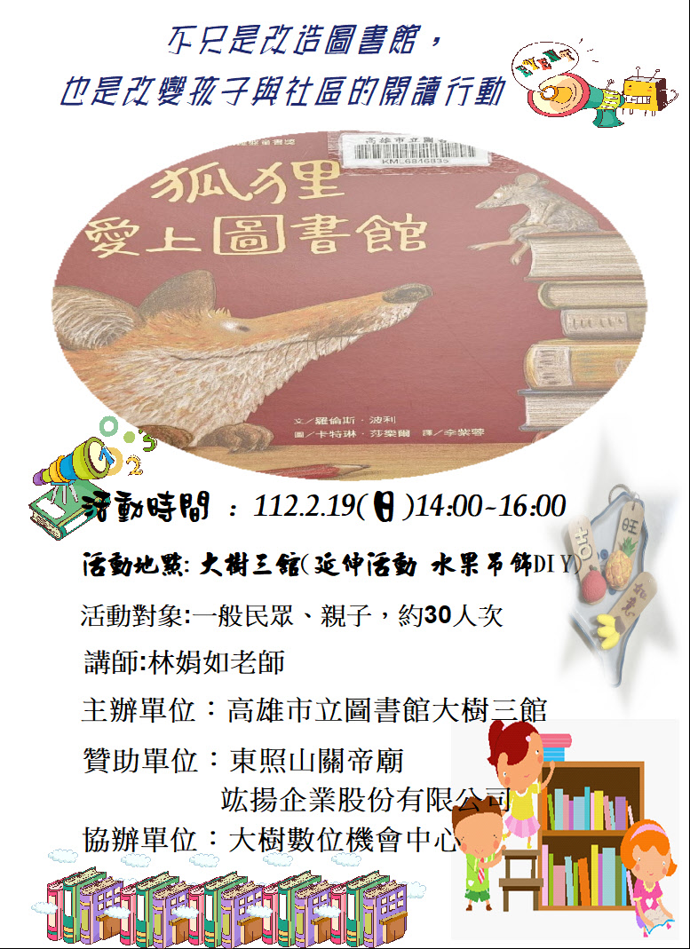 活動地點 : 高雄市立圖書館大樹三館 (高雄市大樹區溪埔里溪埔路77號3樓)