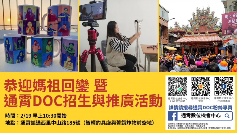 通霄數位機會中心將於2/19早上10:30恭迎媽祖回鑾同時舉辦招生推廣活動。