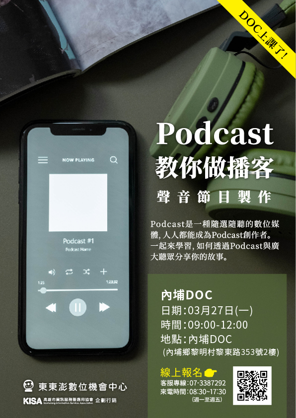 最新消息 DOC快訊 ::: <上一則 返回列表 下一則> 【Podcast 教你做播客 】 發布日期:2023-02-23 人氣:154 學習製作Podcast 透過聲音傳遞你的經歷、理念、想法等 與大家分享屬於你的故事! 時間: 112/03/27(一) 09:00-12:00 地址:內埔DOC(屏東縣內埔鄉黎明村黎東路353號2樓) 報名網址https://reurl.cc/eXEYxQ <上一則 返回列表 下一則>