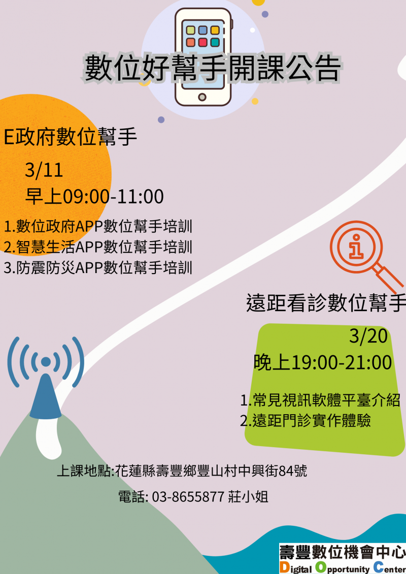最新消息 DOC快訊 ::: <上一則 返回列表 下一則> 3月輔導團課程-數位幫手系列課程 發布日期:2023-03-03 人氣:238 壽豐DOC免費課程來囉~~~ E政府數位幫手 日期與時間:3/11 早上09:00-11:00 1.數位政府APP數位幫手培訓 2.智慧生活APP數位幫手培訓 3.防震防災APP數位幫手培訓 遠距看診數位幫手 日期與時間: 3/20 晚上19:00-21:00 1.常見視訊軟體平臺介紹 2.遠距門診實作體驗 地址:花蓮縣壽豐鄉豐山村中興街84號(壽豐DOC) <上一則 返回列表 下一則>