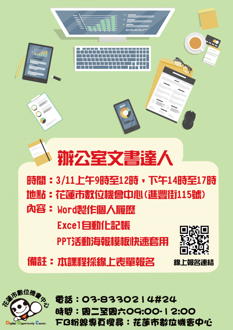 最新消息 DOC快訊 ::: <上一則 返回列表 下一則> 1120311「辦公室文書達人」開課囉~ 發布日期:2023-03-03 人氣:230 課程名稱: 辦公室文書達人 想學習Office的軟體應用嗎?這堂我們將學習 Word製作個人履歷及PPT活動海報模板快速套用、 Excel自動化記帳功能喔~有興趣的你~千萬別錯過喔! 日期時間:112/03/11(六)09:00-12:00、14:00-17:00 (共計6小時,須全程參與) 名額:15 位 ▲地點:花蓮市進豐街115號 (花蓮市數位機會中心教室) <上一則 返回列表 下一則>