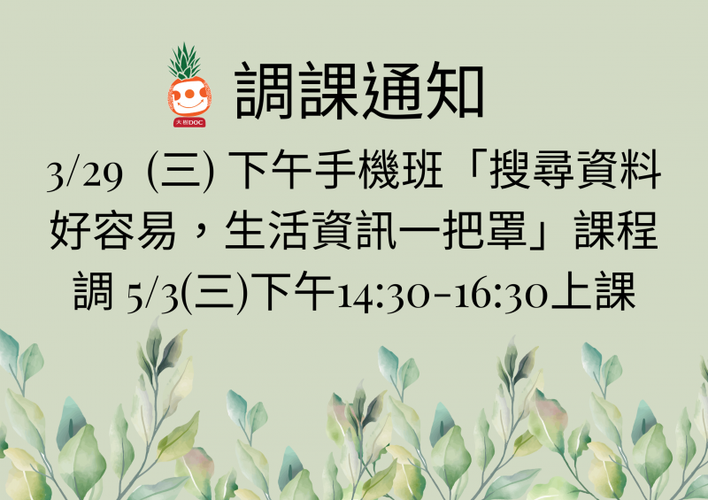 最新消息 DOC快訊 ::: <上一則 返回列表 下一則> 大樹DOC 調課通知 3/29課程調5/3上課 發布日期:2023-03-29 人氣:215 3/29(三)下午手機班課程「搜尋資料好容易,生活資訊一把罩」課程 調5/3(三)下午14:30-16:30上課 <上一則 返回列表 下一則>