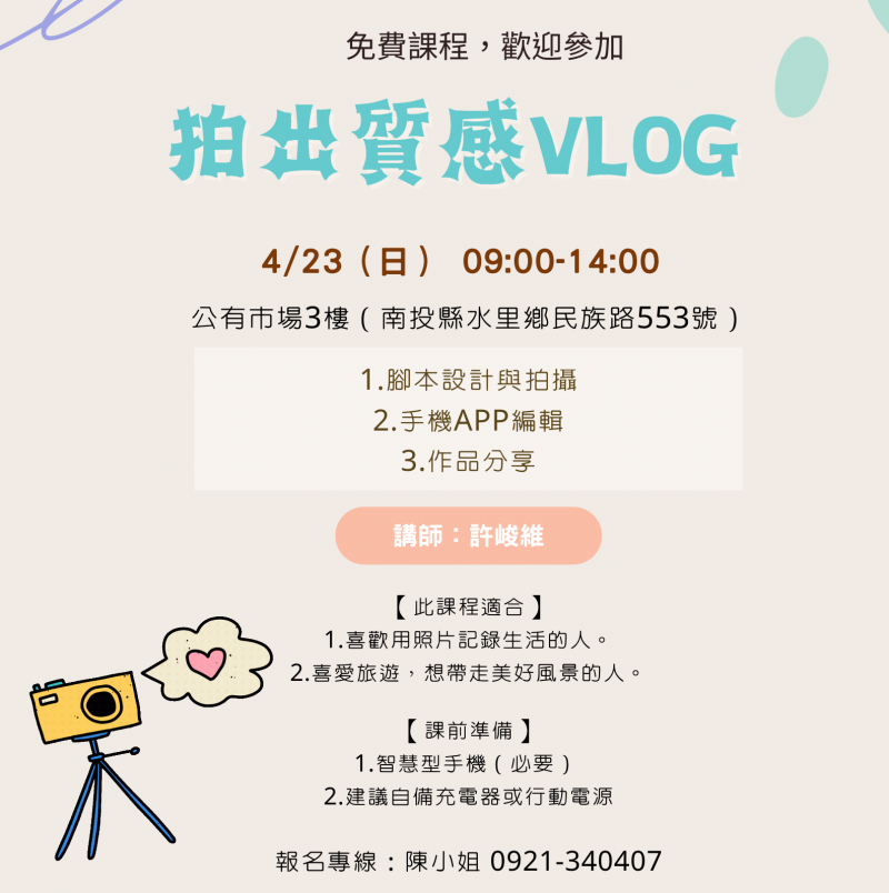 最新消息 DOC快訊 ::: <上一則 返回列表 下一則> 水里DOC_公拍出質感VLOG課程招生公告 發布日期:2023-04-15 人氣:224 拍出質感VLOG課程招生簡章DM. <上一則 返回列表 下一則>