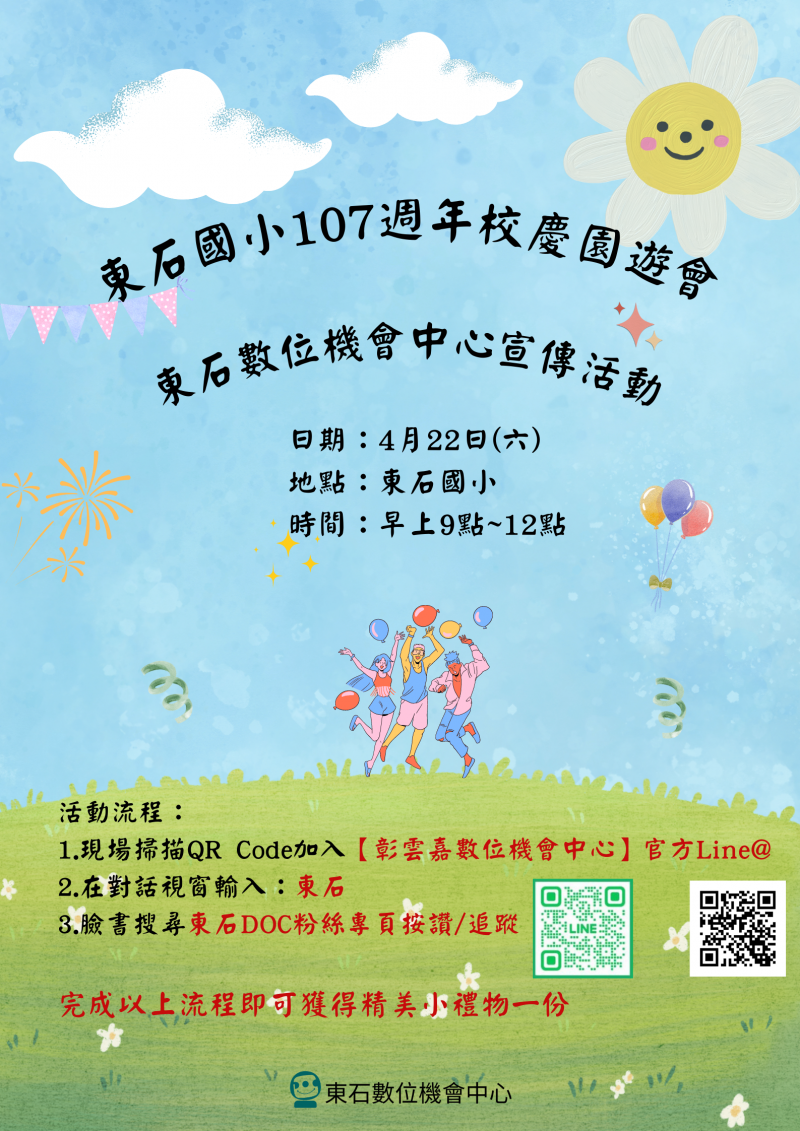 最新消息 DOC快訊 ::: <上一則 返回列表 下一則> 校慶宣傳活動 發布日期:2023-04-19 人氣:179 東石國小107歲了 慶祝107週年慶 學校將在4月22號舉辦107週年校慶運動會暨母親節慶祝活動 當天有學童表演活動,還有東石數位機會中心也會在現場舉辦宣傳活動 時間:4月22日(星期六)早上9點~12點 地點:海天走廊盡頭(職員辦公室外) 活動中完成以下指定項目就可以獲得精美小禮物 掃描QR Code 加入『彰雲嘉數位機會中心』LINE@,並回覆訊息 臉書東石DOC粉絲專頁按讚or追蹤 4月22號邀請大家一起來同樂拿好禮喔~ <上一則 返回列表 下一則>