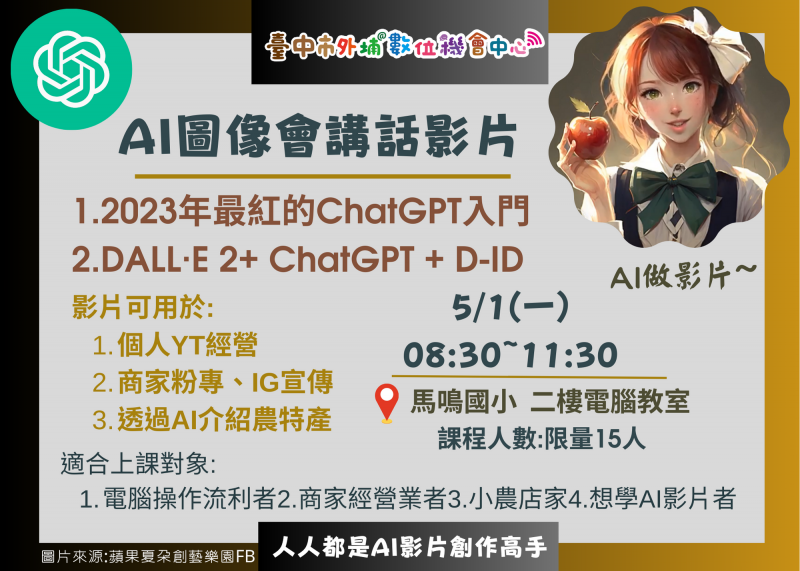 最新消息 DOC快訊 ::: <上一則 返回列表 下一則> 臺中市外埔數位機會中心~5/1(一)AI圖像會講話影片~課程招生中~歡迎踴躍報名 發布日期:2023-04-20 人氣:200 <上一則 返回列表 下一則>