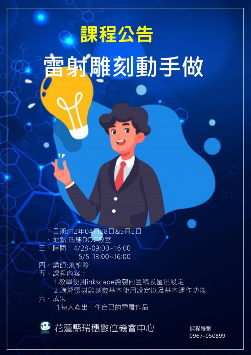 最新消息 DOC快訊 ::: <上一則 返回列表 下一則> 雷射雕刻動手做 發布日期:2023-04-20 人氣:154 1.教學使用inkscape繪製向量稿及匯出設定 2.講解雷射雕刻機基本使用設定以及基本運作功能 1.每人產出一件自己的雷雕作品 <上一則 返回列表 下一則>