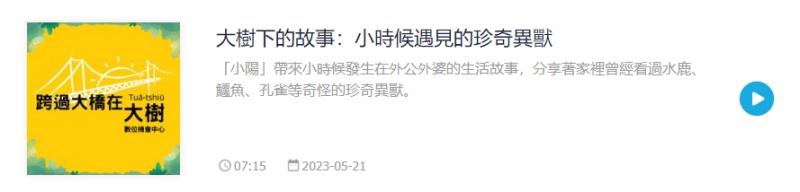「跨過大橋在大樹」頻道由課堂學員共同開創的聲音分享平台,藉由在地學員分享大樹的生活經驗,讓更多人了解高雄大樹的好故事 !「大樹區有大橋,大橋下有大樹,跨過大橋聽故事。」