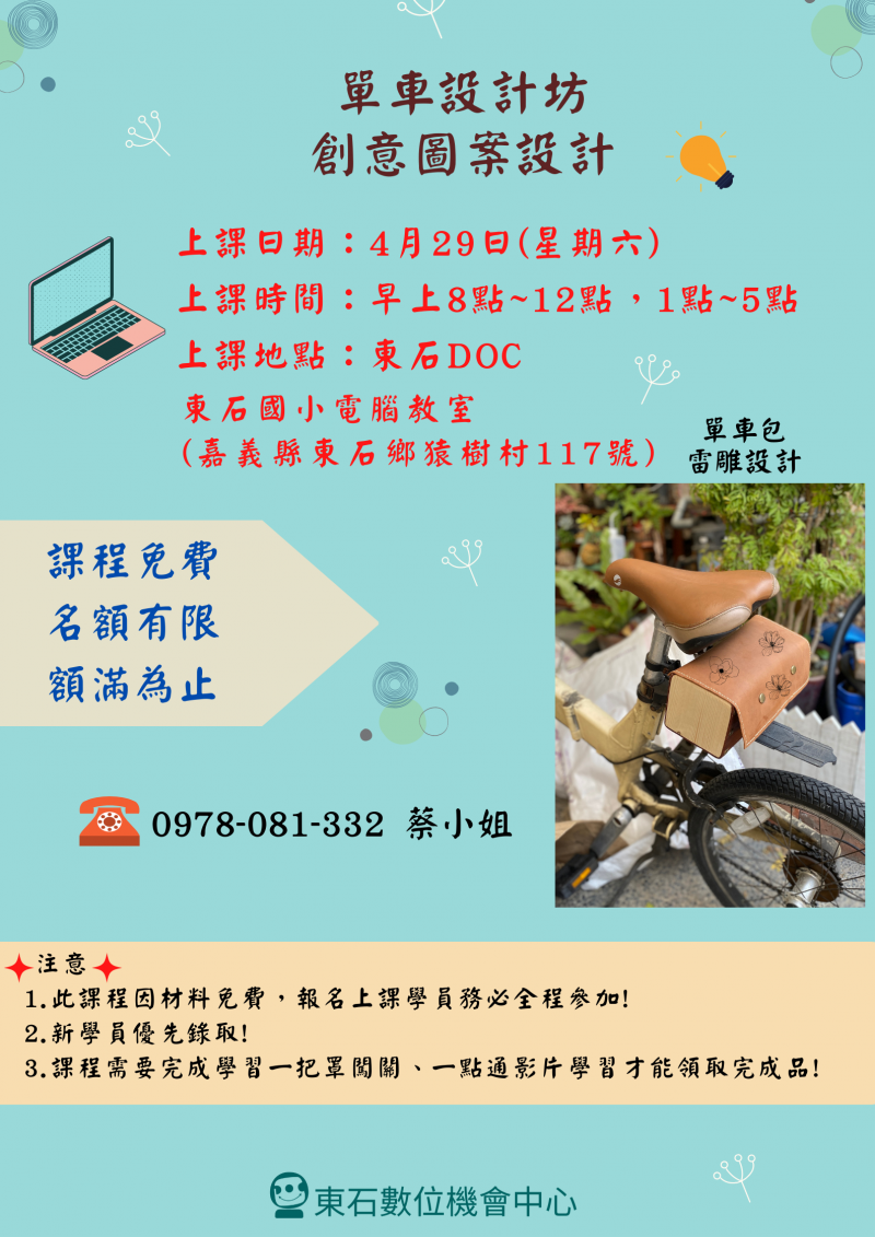 最新消息 DOC快訊 ::: <上一則 返回列表 下一則> 單車設計坊-創意圖案設計要開課了 發布日期:2023-04-17 人氣:146 今年度備受關注的課程- 單車設計坊(雷雕單車包)終於要開課了 單車設計坊-創意圖案設計 上課日:4月29日(星期六) 上課時間:早上8:00~12:00 下午1:00~5:00 上課地點:東石DOC(東石國小電腦教室) 課程免費,名額有限,額滿為止 本課程因材料免費,報名上課學員務必全程參與 新學員優先錄取 課程需要完成學習一把罩闖關,一點通影片學習才能領取成品 僅開一班,手刀快報名,錯過就沒有囉~ <上一則 返回列表 下一則>