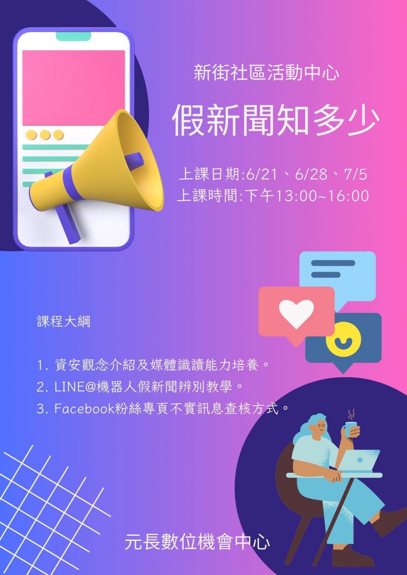 6月份行動DOC課程   課程大綱  1. 資安觀念介紹及媒體識讀能力培養。  2. LINE@機器人假新聞辨別教學。  3. Facebook粉絲專頁不實訊息查核方式。    「假新聞知多少」課程  上課日期:6/21、6/28、7/5