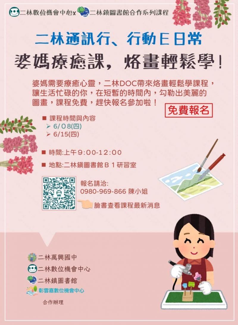 夏天到來已經感受到熱情如火的太陽了嗎? 二林DOC也準備好給大家每個月豐富的課程 六月份課程出爐囉! 這次是DIY烙畫課程,烙畫是什麼呢? 利用高溫鐵筆烙燙圖案在木片上,不需要繪畫基礎也可以喔! 外面一堂課程要1000~2000還要支付材料費 來DOC有專業老師教你還不用支付任何費用 也太好康了吧!! 小編剛放上海報已經剩一半名額了!! 慢一步就沒了快打電話報名啊!