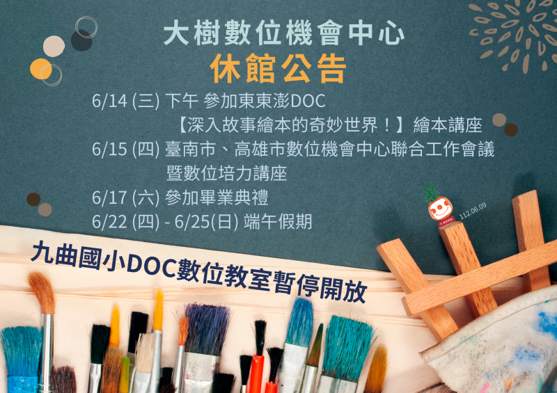 最新消息 DOC快訊 ::: <上一則 返回列表 下一則> 大樹DOC 112年6月休館公告 發布日期:2023-06-09 人氣:128 大樹數位機會中心 休館公告 6/14 (三) 下午 參加東東澎DOC 【深入故事繪本的奇妙世界!】繪本講座 6/15 (四) 臺南市、高雄市數位機會中心聯合工作會議 暨數位培力講座 6/17 (六) 參加畢業典禮 6/22 (四) - 6/25(日) 端午假期 九曲國小DOC數位教室暫停開放 <上一則 返回列表 下一則>