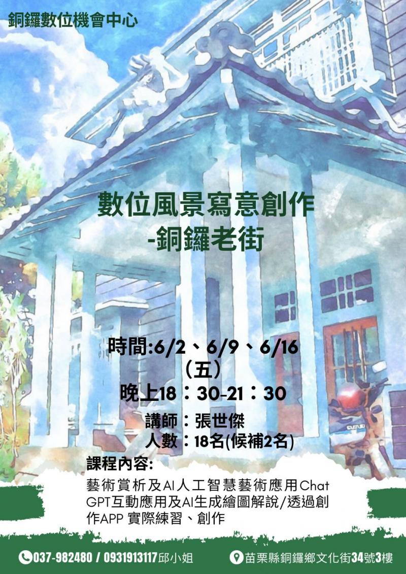 最新消息 DOC快訊 ::: <上一則 返回列表 下一則> 數位風景寫意創作-銅鑼老街 發布日期:2023-06-11 人氣:143 解說目前最受歡迎話題,Ai人工智慧繪圖及Chat GPT <上一則 返回列表 下一則>