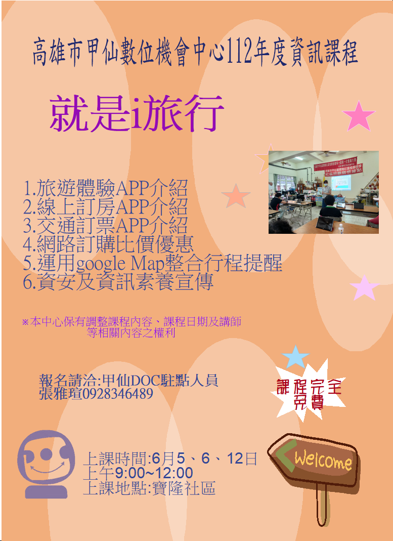 最新消息 DOC快訊 ::: <上一則 返回列表 下一則> 【甲仙DOC】資訊課程~就是i旅行開課日期:6月5、6、12日早上9:00~12:00 發布日期:2023-06-01 人氣:102 上課地點:寶隆社區 <上一則 返回列表 下一則>