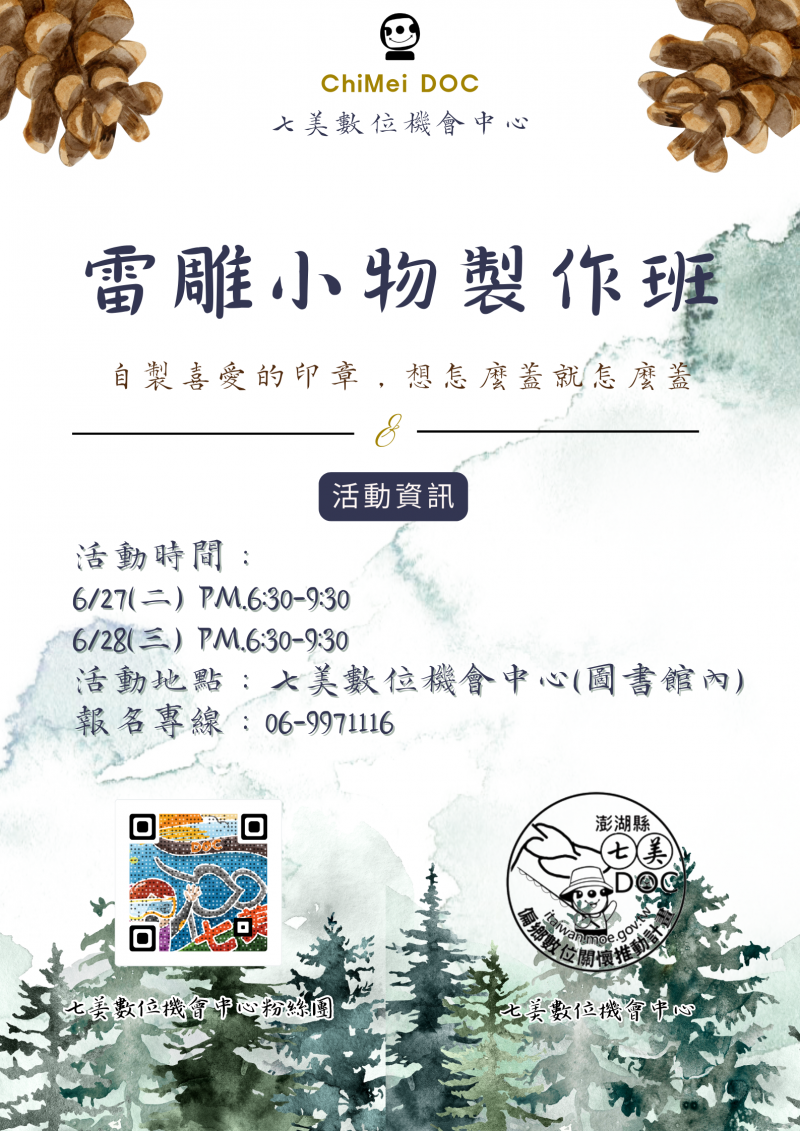 最新消息 DOC快訊 ::: <上一則 返回列表 下一則> 【課程報名】雷雕小物製作班 發布日期:2023-06-20 人氣:174 七美DOC預計舉辦資訊課程「雷雕小物製作班」課程 想要特別的印章? 但是只能花錢客製化? 就讓七美DOC手把手教你 從無到有 做出你喜愛的印章吧! 想怎麼蓋就怎麼蓋 想怎麼用就怎麼用 ◆─活動資訊─◆ 活動時間: 6/27(二) 晚上6點30分─9點30分 6/28(三) 晚上6點30分─9點30分 活動地點:七美數位機會中心(七美圖書館內) 報名專線:06-9971117 許小姐 <上一則 返回列表 下一則>
