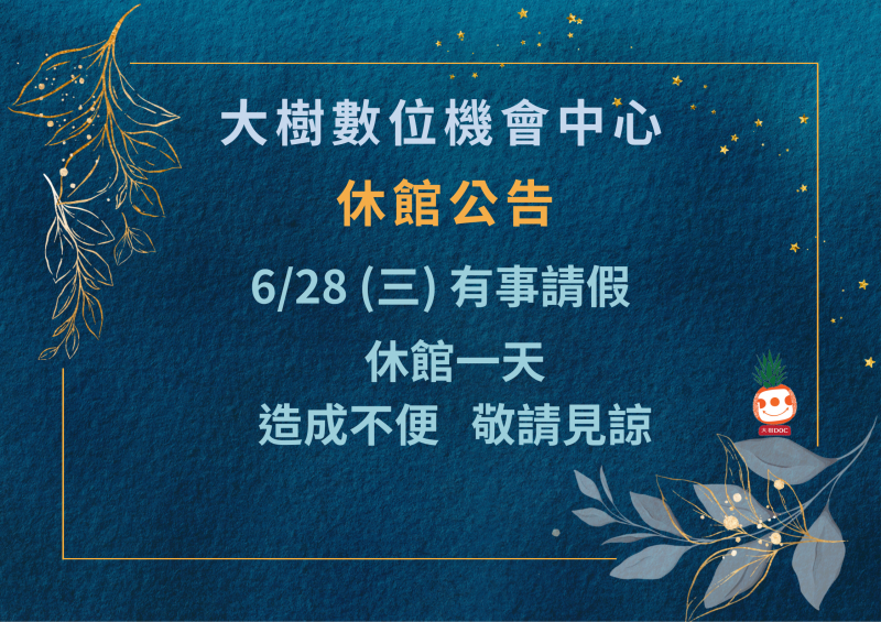 最新消息 DOC快訊 ::: <上一則 返回列表 下一則> 大樹DOC 6/28休館一天 發布日期:2023-06-28 人氣:143 大樹數位機會中心 6/28 (三) 有事請假 休館一天 造成不便 敬請見諒 <上一則 返回列表 下一則>