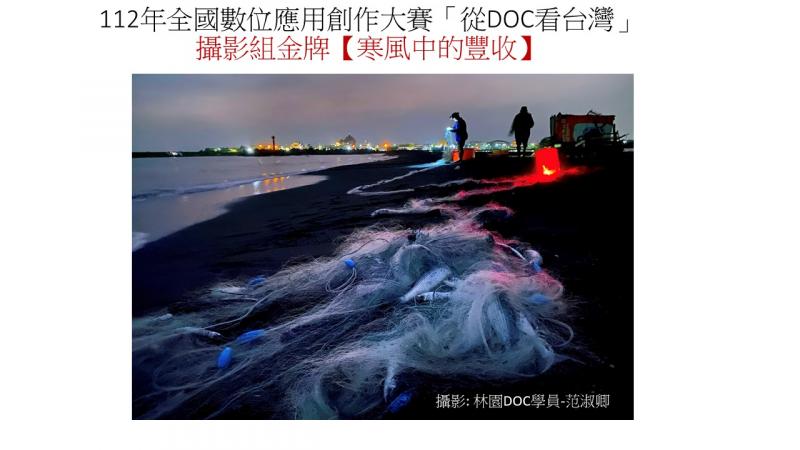 112年教育部舉辦「從DOC看台灣」攝影比賽,手機攝影組金牌范淑卿是高雄市林園區的家庭主婦,作品「寒風中的豐收」寫實記錄捕捉烏魚過程;同樣來自林園的劉瀞文在從事生態解說員過程中,用鏡頭記錄家鄉,拿銅牌與佳作。