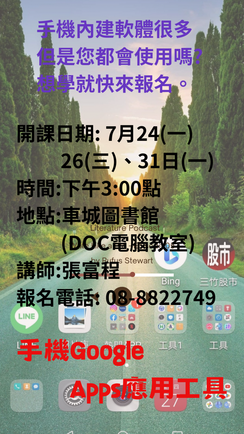 最新消息 DOC快訊 ::: <上一則 返回列表 下一則> 手機Google Apps 應用工具 發布日期:2023-07-03 人氣:137 手機Google Apps 應用工具 一機在手,世界有我,手機內建軟體很多,但是您都會使用嗎?想學就快來報名。 車城DOC與講師帶領大家一起,學習靈活運用手機內建APP的使用與了解手機各項功能運用,名額有限,歡迎報名喔。 開課日期:7月24(一)、26(三)、31(一) 時間:下午3點 講師: 張富程 地點:車城圖書館(DOC電腦教室) 報名電話: 08-8822749 <上一則 返回列表 下一則>
