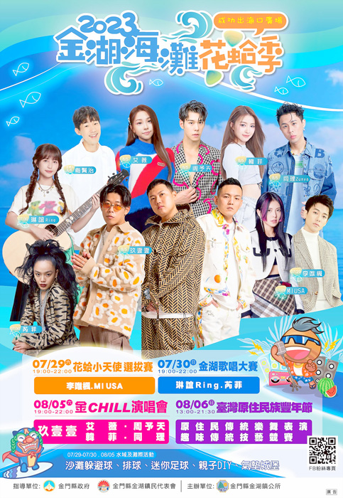 金湖海灘花蛤季今年恢復在暑假正常舉辦,日期訂為7月29日、30日、8月5日、6日舉行,活動包括迷你足球賽、沙灘排球賽、沙灘躲避球賽、花蛤小天使選拔賽、歌唱大賽等,另外還有「金CHILL演唱會」,壓軸最大咖是天團「玖壹壹」再度重回金門演唱,屆時勢必嗨翻成功海灘。