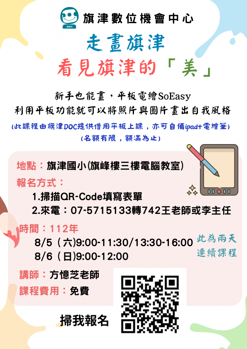 最新消息 DOC快訊 ::: <上一則 返回列表 下一則> 走畫旗津,看見旗津的美(平板電繪) 發布日期:2023-07-06 人氣:134 時間:112年 8/5(六) 9:00-11:30/13:30-16:00 8/6(日) 9:00-12:00 此為兩天連續課程 課程費用:完全免費 地點:旗津國小旗峯樓3樓電腦教室 (海科大對面東大門進出) 課程內容: 簡易平板電繪功能 <上一則 返回列表 下一則>