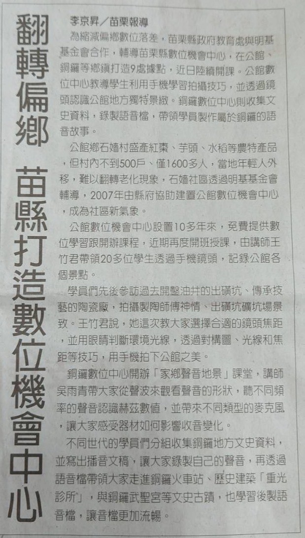 最新消息 DOC快訊 ::: <上一則 返回列表 下一則> 翻轉偏數 苗栗打造數位機會中心 發布日期:2023-07-22 人氣:137 中國時報 112 年 7 月 4 日 <上一則 返回列表 下一則>