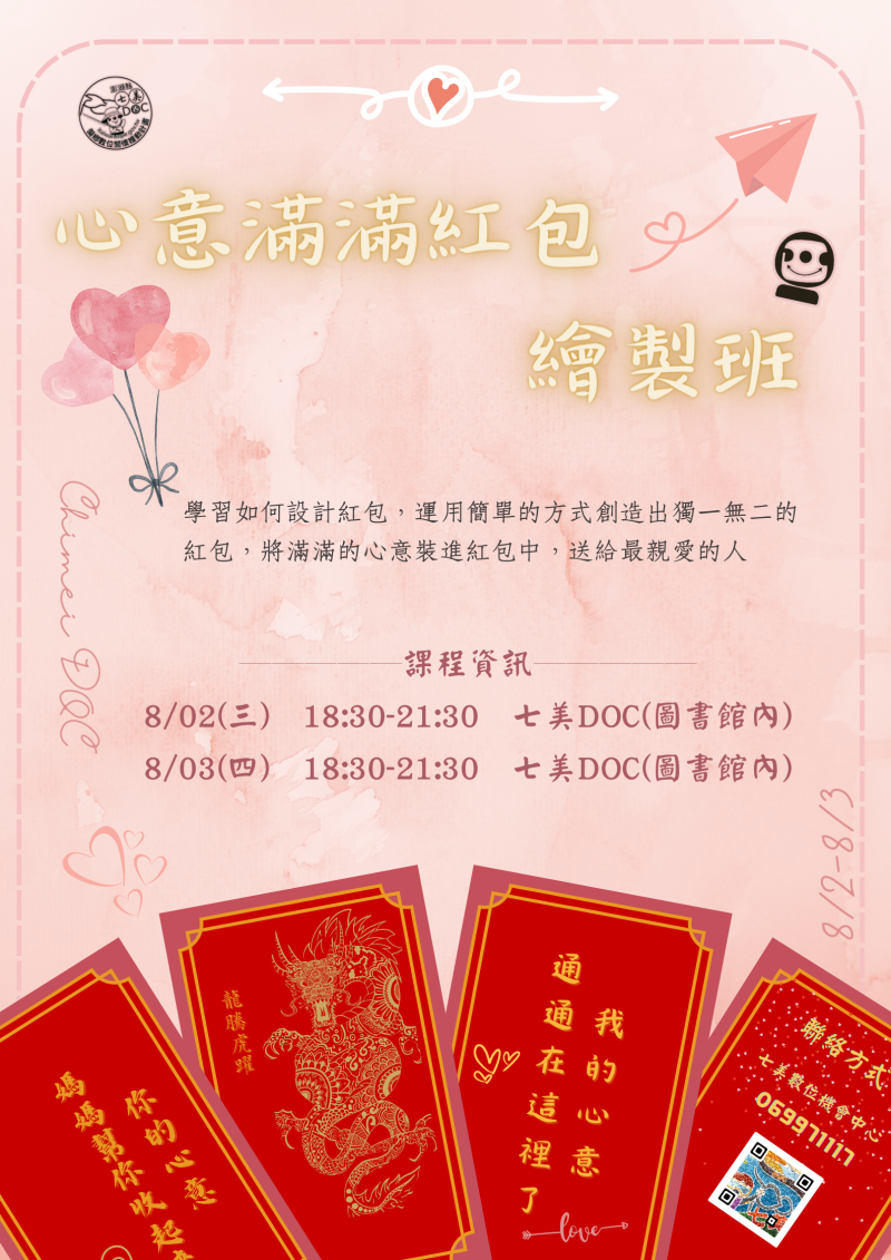 最新消息 DOC快訊 ::: <上一則 返回列表 下一則> 【課程報名】心意滿滿紅包繪製班 發布日期:2023-07-29 人氣:146 將溫暖化獨一無二的設計,心意滿滿紅包繪製班! 紅包繪製,藝術傳遞。讓您的心意,融入每一份祝福! 我們誠摯地邀請您參加心意滿滿紅包繪製班。 不再局限於傳統的紅包,這次,您將親手設計屬於自己的獨特紅包,讓您的祝福更有溫度! 【活動資訊】 活動時間: 8/2(三) 18:30─21:30 七美DOC(圖書館內) 8/3(四) 18:30─21:30 七美DOC(圖書館內) 報名方式:06-9971117 or 於底下留言即可 <上一則 返回列表 下一則>