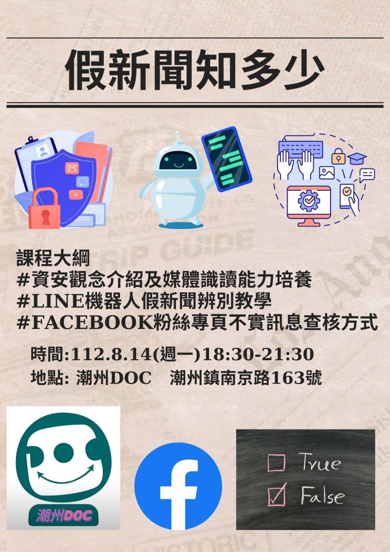 最新消息 DOC快訊 ::: <上一則 返回列表 下一則> 112.8.14假新聞知多少 發布日期:2023-08-11 人氣:169 112.8.14假新聞知多少【潮州DOC免費手機課】 網路搶先報名 : https://forms.gle/y5K77qGz4wYUJkwU6 112.8.14(週一)18:30-21:30 招生對象:20位(候補5位) 課程大綱 #資安觀念介紹及媒體識讀能力培養 #Line機器人假新聞辨別教學 #Facebook粉絲專頁不實訊息查核方式 <上一則 返回列表 下一則>