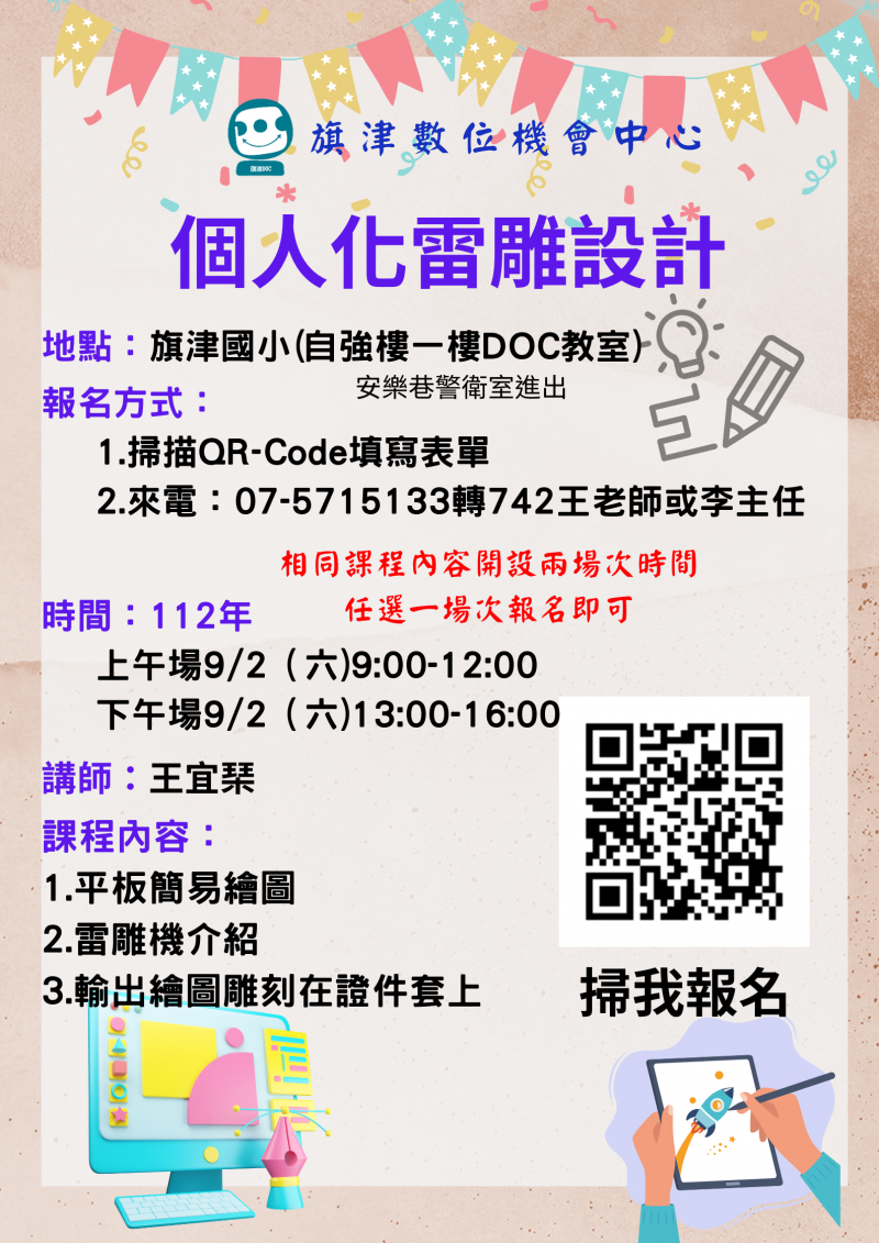 最新消息 DOC快訊 ::: <上一則 返回列表 下一則> 個人化雷雕設計 發布日期:2023-08-15 人氣:230 時間:112年 上午場9/2(六)9:00-12:00 下午場9/2(六)13:00-16:00 (相同課程內容開設兩場次時間 任選一場次報名即可) 講師:王宜琹 地點:旗津國小(自強樓一樓DOC教室,安樂巷警衛室進出) 報名方式: 1.掃描QR-Code填寫表單 2.來電:07-5715133轉742王老師或李主任 課程內容: 1.平板簡易繪圖 2.雷雕機介紹 3.輸出繪圖雕刻在證件套上 <上一則 返回列表 下一則>