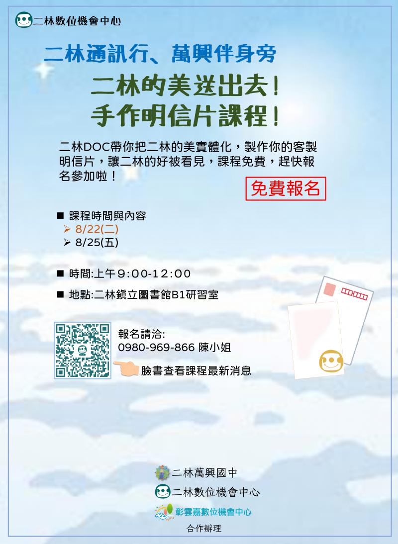 最新消息 DOC快訊 ::: <上一則 返回列表 下一則> 明信片製作 發布日期:2023-08-17 人氣:175 各位同學~ 8月「明信片」課程開放報名囉! 最近因疫情解禁,大家都開始陸續出國遊玩! 想要把出遊照片做成紀念品嗎? 還可以寄給親朋好友唷! 這週上完攝影課程的同學們也可以把上課中的照片做成明信片喔! 提醒課程都是兩堂一起報名喔! 課程皆使用DOC平板 需備妥個人google 帳號密碼 <上一則 返回列表 下一則>