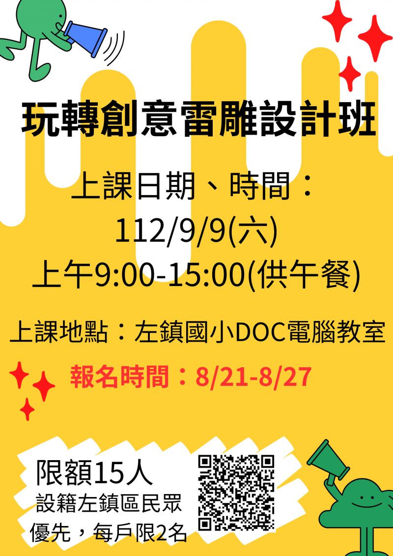 最新消息 DOC快訊 ::: <上一則 返回列表 下一則> DOC課程《玩轉創意雷雕設計》活動訊息出爐了..............名額有限,趕快來報名呦!! 發布日期:2023-08-18 人氣:257 玩轉創意雷雕設計課程,報名期間自8/21-8/27截止,請掃描海報上QR Code或點選以下連結:https://forms.gle/VZq7LySzXnfhCFCR8 <上一則 返回列表 下一則>