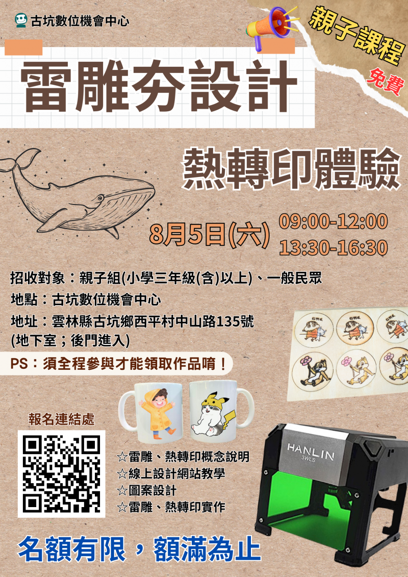 最新消息 DOC快訊 ::: <上一則 返回列表 下一則> 課程招生囉~ 雷雕夯設計/熱轉印體驗 發布日期:2023-07-20 人氣:118 課程免費~名額有限 額滿為止 日期:8月05日 (星期六) 時間:早上 09:00-12:00、下午13:30-16:30 招收對象:親子組(小學三年級(含)以上)、一般民眾 地點:古坑數位機會中心 地址:雲林縣古坑鄉西平村中山路135號 ( 地下室;後門進入 ) 報名連結處: https://forms.gle/4GELBG6asdkvCuo6A ☆☆☆提醒~提醒~提醒 ☆☆☆ 1.報名時,請斟酌上課時間是否可到 2.請珍惜免費學習資源,請務必全程參與唷 <上一則 返回列表 下一則>