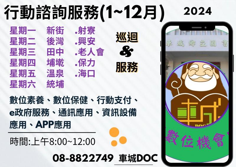 最新消息 DOC快訊 ::: <上一則 返回列表 下一則> 車城DOC 113年行動諮詢服務 發布日期:2024-01-03 人氣:299 【車城DOC行動諮詢服務】 數位潮流已深入我們的生活,為強化民眾的數位應用能力並服務到不便前來圖書館的鄉親朋友,今年起會在社區關懷據點日前往社區為大家服務,只要是對手機、平板、電腦方面使用上有問題的都可以來詢問及學習! 時間:早上8:00~12:00 諮詢主題:數位素養、數位保健、行動支付、e政府服務、通訊應用、資訊設備應用、APP應用 <上一則 返回列表 下一則>