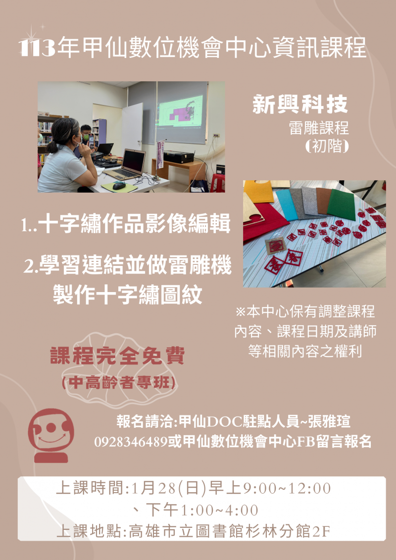 最新消息 DOC快訊 ::: <上一則 返回列表 下一則> 【甲仙DOC】113年行動DOC電腦資訊課程:平埔印記~雷雕課程初階開跑囉! 發布日期:2024-01-03 人氣:165 開課地點:高雄市立圖書館杉林分館 開課時間:1月28日早上9:00~12:00及下午1:00~4:00 <上一則 返回列表 下一則>
